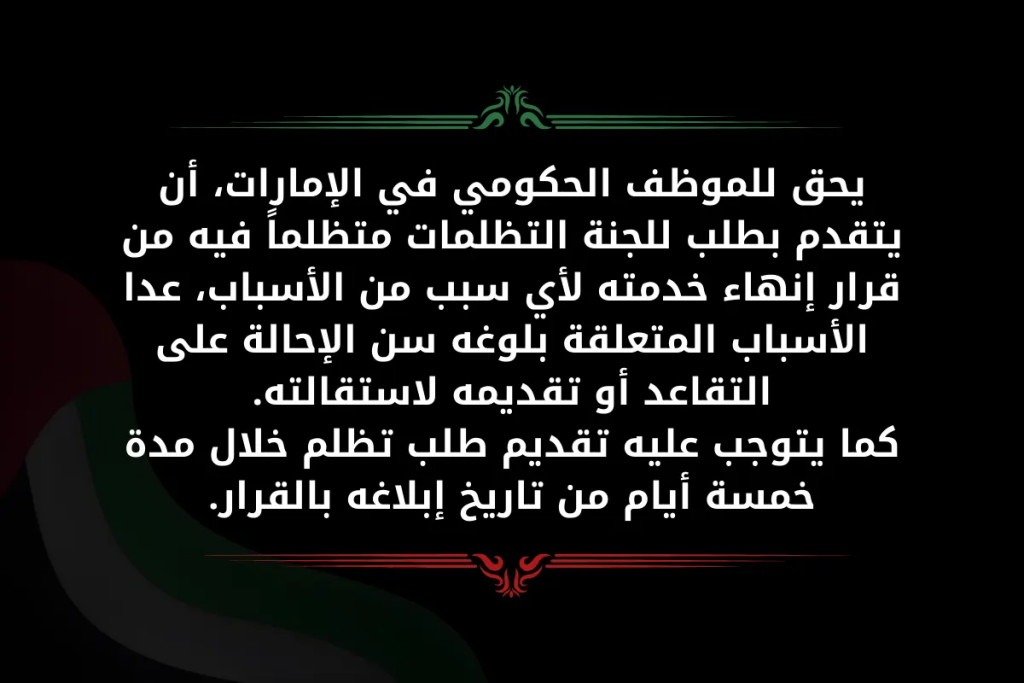 وبكافة الأحوال يحق للموظف الحكومي في الإمارات، أن يتقدم بطلب للجنة التظلمات متظلماً فيه من قرار إنهاء خدمته لأي سبب من الأسباب، عدا الأسباب المتعلقة بلوغه سن الإحالة على التقاعد أو تقديمه لاستقالته.