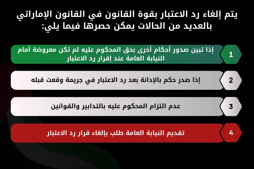 إن رد الاعتبار ذو أثر مستقبلي دائم، إلا أنه قابل للزوال في العديد من الحالات التي حددها القانون الاتحادي الصادر بشأن رد الاعتبار في المادة 12، ويمكن حصرها فيما يلي: