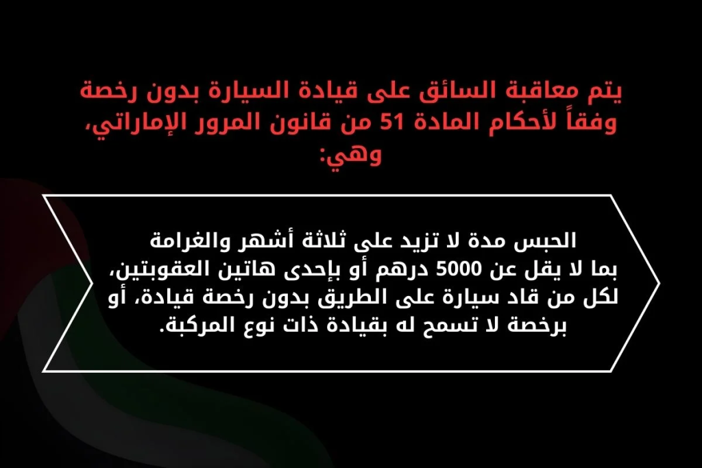 حيث يتم معاقبة السائق على قيادة السيارة بدون رخصة وفقاً لأحكام المادة 51 من قانون المرور الإماراتي، وهي: