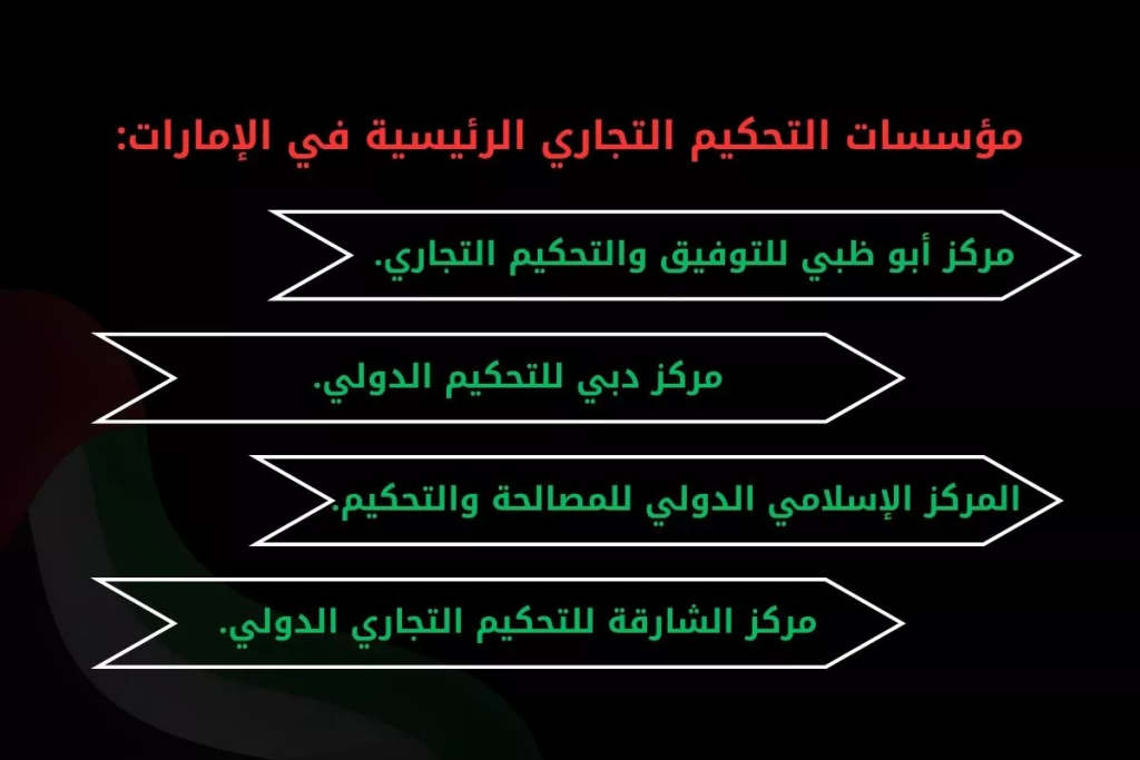 أما مؤسسات التحكيم الرئيسية في الإمارات نذكر منها: