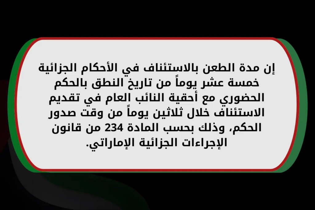 أما في الأحكام الجزائية فإن مواعيد الطعن بالاستئناف هي 15 يوماً من تاريخ النطق بالحكم الحضوري مع أحقية النائب العام في أن يستأنف في ميعاد 30 يوماً من وقت صدور الحكم، وذلك بحسب المادة 234 من قانون الإجراءات الجزائية الإماراتي.