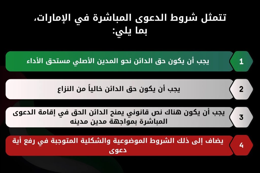 تتمثل شروط الدعوى القضائية المباشرة في الإمارات، بما يلي: