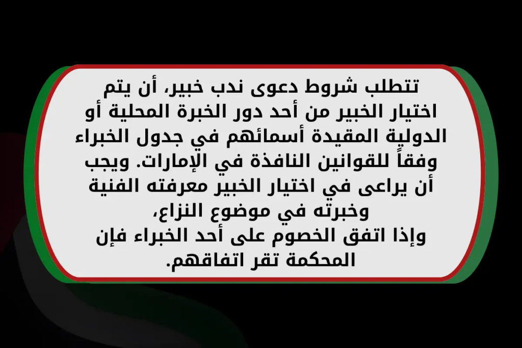 وتتطلب شروط دعوى ندب خبير، أن يتم اختيار الخبير من أحد دور الخبرة المحلية أو الدولية المقيدة أسمائهم في جدول الخبراء وفقاً للقوانين النافذة في الإمارات.
